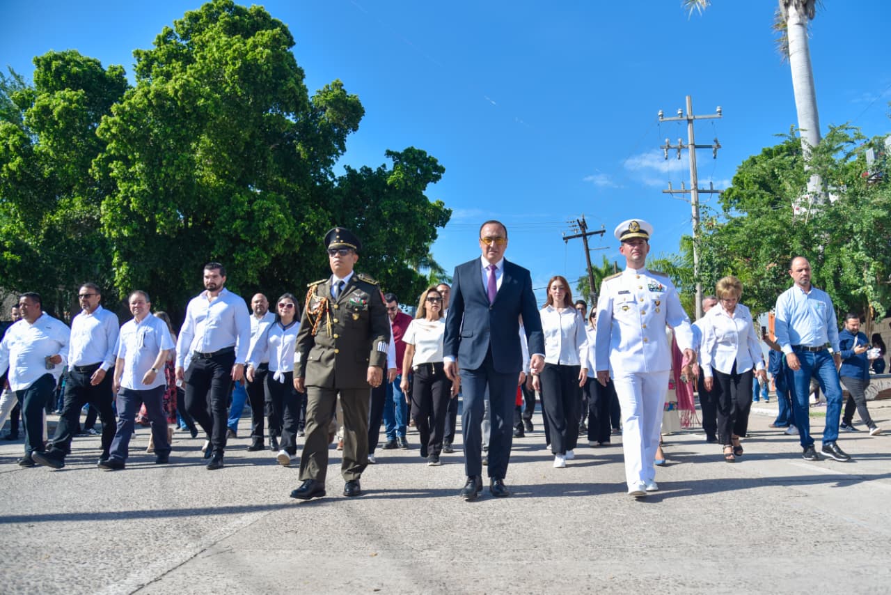 En el recorrido del desfile participaron autoridades civiles, militares y educativas, encabezadas por el Alcalde Antonio Menéndez De Llano Bermúdez, seguidos por elementos de Tránsito Municipal motorizados en punta de lanza, Banderín del Ayuntamiento de Ahome, funcionarios, regidores, mandos militares y diputados y diputadas locales y federales, entre otros.