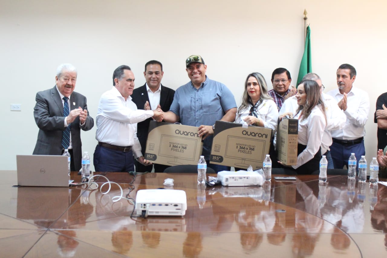 Madueña Molina, acompañado del director de la Facultad, se reunió con egresados y empresarios interesados en coordinarse con la Universidad para apoyarla, y como ejemplo de ello donaron equipos de cómputo a la Facultad.