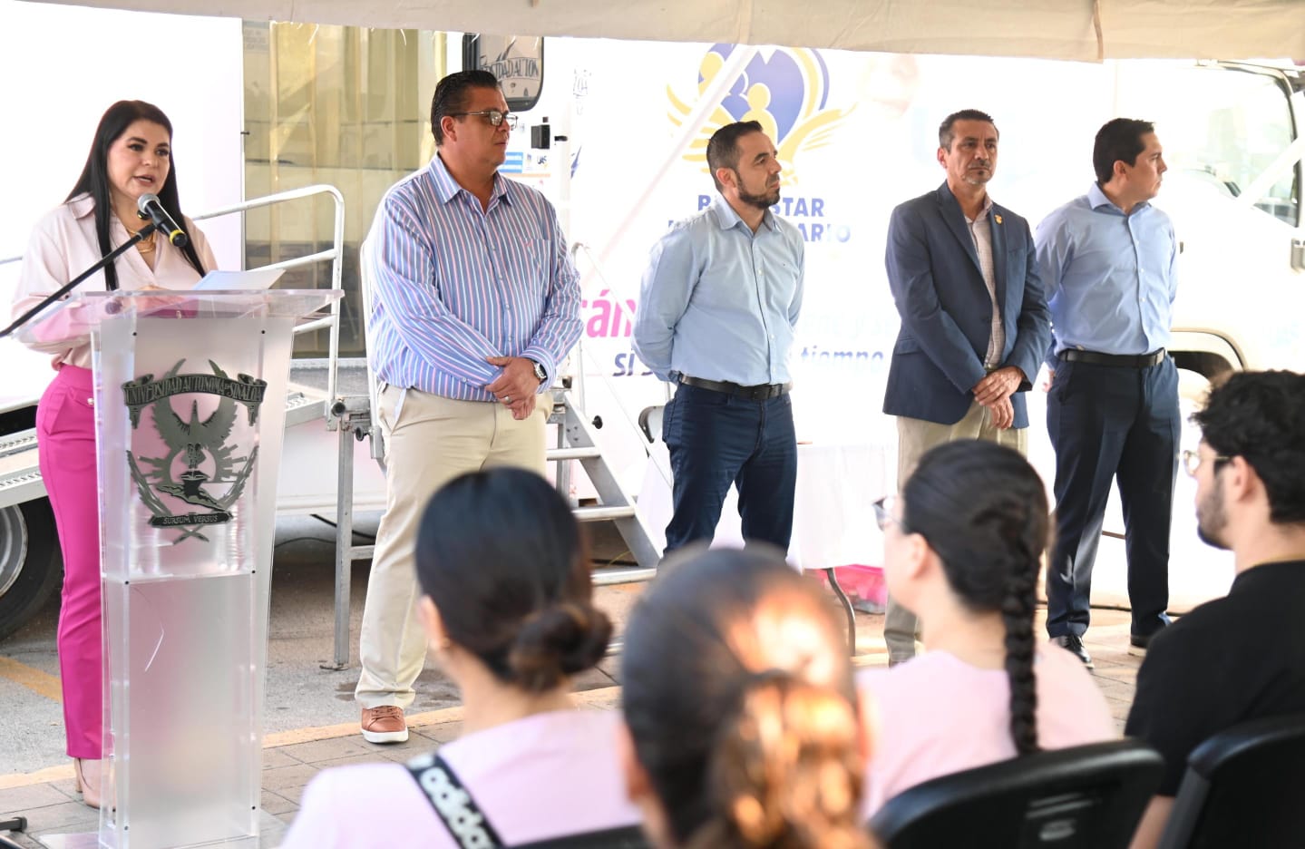 La directora de Bienestar Universitario, doctora Sofía Angulo Olivas, al encabezar el evento, señaló que este Programa inició hace un mes en el Campus Buelna Tenorio y ahora se traslada la Unidad Móvil a los jardines de la Facultad de Derecho, para hacer llegar todos los beneficios que lo integran a más universitarios por lo que exhortó a que todos lo aprovechen.